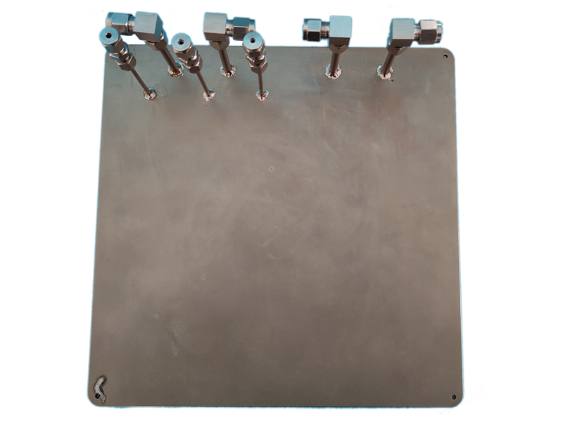 MF-V9M高溫高壓金屬微通道反應器焊接式采用無縫焊接技術實現了整個平面的焊接而非焊邊角,焊接強度遠遠高于電阻焊、碰焊。焊接式金屬微反應器工藝側采用了分離剪切-結合-分離剪切的流道模型,兼顧了傳質與壓降兩大因素,在壓降最小化的基礎上使傳質過程效率最大化,同時在工藝板的兩側集成了特殊傳熱結構的換熱板,通過高效的雙向對流傳熱,釋放反應過程中的熱量,安全穩定地實現小試及中試的反應工藝過程。