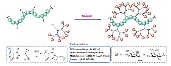 除聚合物的合成,連續(xù)流光反應(yīng)技術(shù)也可應(yīng)用于聚合物的化學修飾。聚合物的后期修飾被認為具有很大的難度,因為在既要保證聚合物鏈的完整又要精確控制修飾的位點。Seeberger[4]等就利用環(huán)加成反應(yīng),在聚賴氨酸上偶聯(lián)上糖分子。修飾過程在FEP塑料管中進行,使用450W中壓力汞燈作為光源,照射40min即可得到很好的收率。